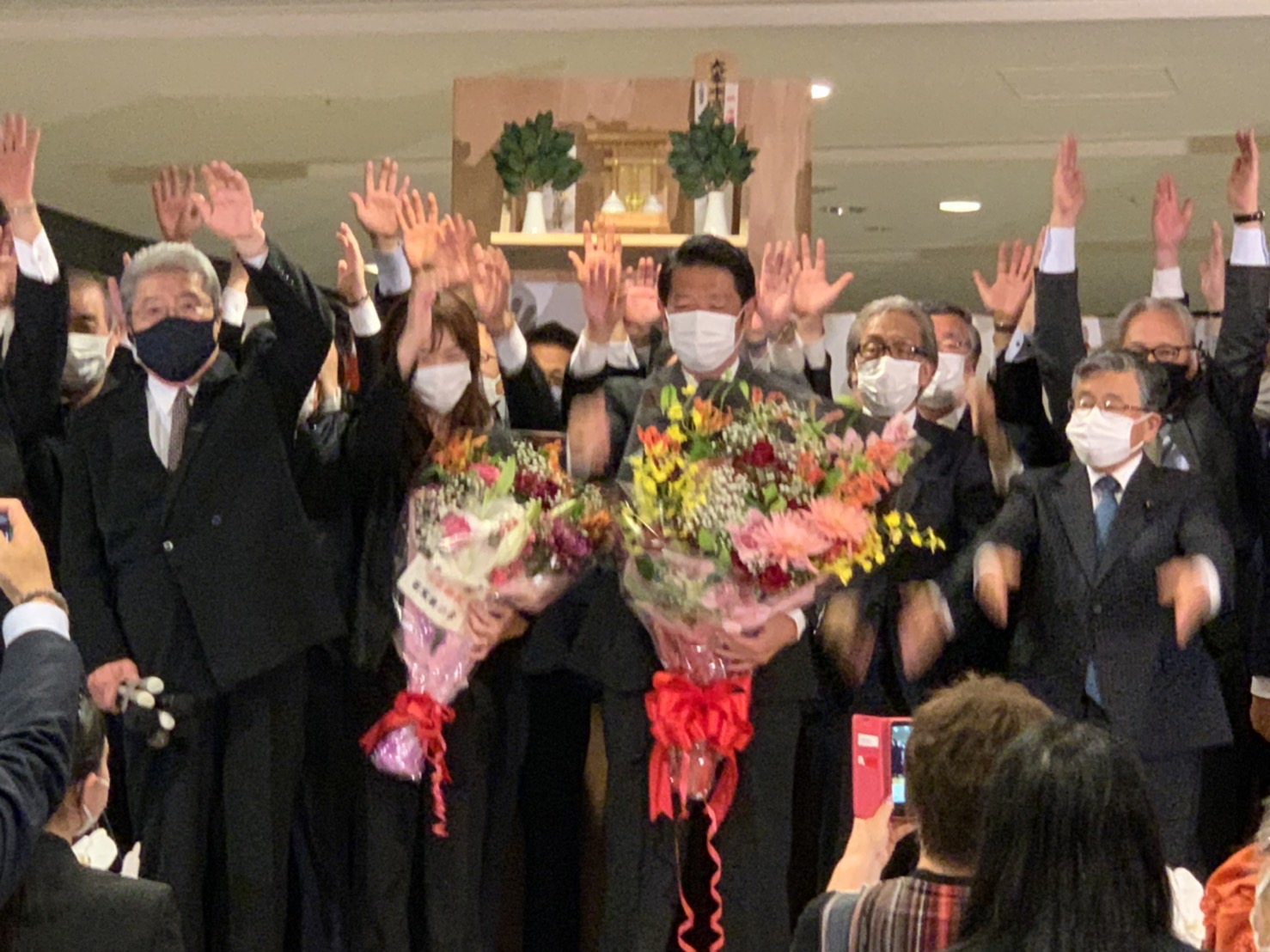 田野瀬氏は「今回の選挙は、政党としての活動はできなかった。それだけに必死になり、650カ所、1万6000人の方と街頭演説させていただいた。22市町村が前向いて頑張れと言っていただいた。22通りのまちづくりを、私が国との橋渡し役となってやっていきます」と喜びを語った。